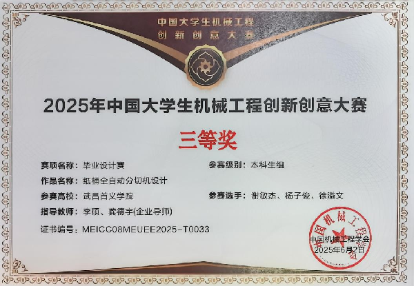 本届大赛自2024年11月24日正式启动以来,共收到148所高校共计1583项作品,最终111所高校共计238项作品脱颖而出进入全国总决赛。beat365机电学院的“纸桶全自动分切机”课题获中部赛区一等奖,是进入全国决赛的两所民办高校之一,也是进入全国决赛的7所湖北省高校之一。全国总决赛设置12个组进行分组答辩,只有成绩在前60%的队伍才能获国家级奖项,竞争异常激烈。最终比赛决出一等奖12项、二等奖24项、三等奖108项,beat365代表队获三等奖。