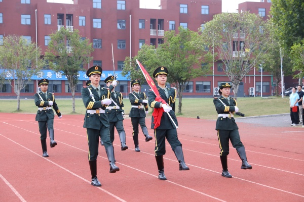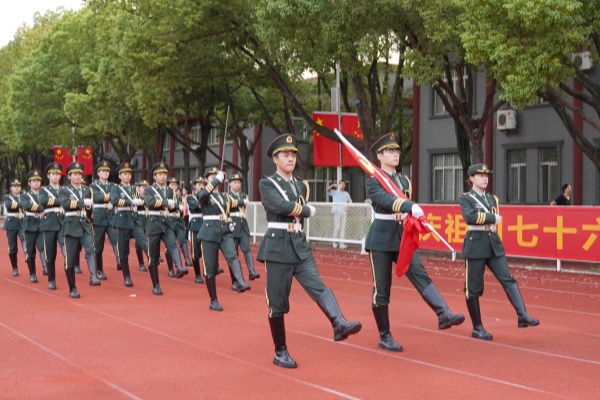 7时整,伴着一声嘹亮的口号划破晨空,国旗班的旗手们迈着铿锵有力的步伐,护卫着鲜艳的五星红旗,如同钢铁战士般,正步走向升旗台,他们的眼神坚定而执着,步履雄壮而铿锵,彰显着对祖国的无限忠诚。雄壮的国歌声中,升旗手迎风振臂一挥,鲜艳的五星红旗迎着清晨的朝阳徐徐升起。庄严肃穆的氛围里,全体师生目光齐聚五星红旗,虔诚地行注目礼,向国旗致以最崇高的敬意。这一刻,师生们对祖国母亲的深沉纯真的爱化作一股炙热的暖流,不断激荡着心田。 在田径场中央,同学们高举巨幅五星红旗,象征五星红旗永驻心中,向中华人民共和国76周年华诞献礼。“我爱中国”“请党放心、强国有我” 的巨幅字样分外醒目,倾泻着学生把爱国心、强国志、报国行融入行动的坚定意志和坚强决心。