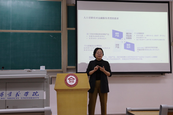 “金融业该如何应对人口老龄化带来的影响呢?”胡国晖以银行业和保险业为例,深入浅出地为同学们介绍了应对人口老龄化的措施。她以“幸福人寿房来宝老年人住房反向抵押养老保险”和“Citi Priority养老金融服务”为例,详细阐述了金融业应对人口老龄化的具体措施。