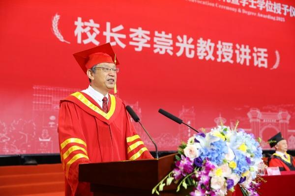 校长李崇光讲话。他代表学校向圆满完成学业的全体毕业生致以最热烈的祝贺。回首同学们四年的成长足迹,他表示,此刻既有“儿行千里母担忧”的不舍,更有“扶摇直上九万里”的期许。他殷殷叮嘱同学们,无论身在何处,都要永远铭记首义人“自强不息、追求卓越”的精神底色。他寄语全体毕业生:向上拔节,做理想坚定的逐梦者;向下生根,做脚踏实地的奋斗者;向新而行,做锐意创新的开拓者;向内沉淀,做修德求真的坚守者。母校永远是你们的精神家园,欢迎常回母校看看。愿大家心怀梦想,眼沐春光,鹏程万里,一生向阳。