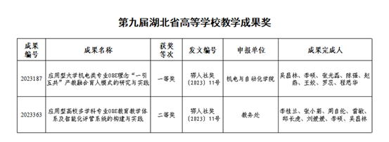 获得一等奖的成果《应用型大学机电类专业OBE理念“一引五共”产教融合育人模式的研究与实践》,是该校国家级一流本科专业建设点机械电子工程专业在应用型人才培养路径探索、模式创新的成果的有效体现。获得二等奖的成果《应用型高校多学科专业OBE教育教学体系及智能化评管系统的构建与实践》,是学校持续贯彻OBE教育理念的实践与凝练。