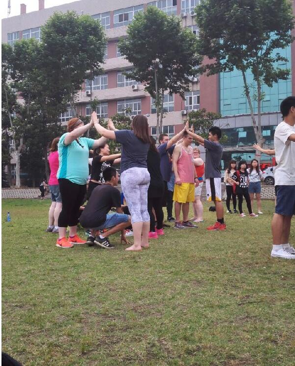 第一个游戏“twister”。外教Suzanne介绍了游戏规则,三个人分为一组,两个人用手搭建成小房子的形状,另一个人躲在房子下面。当Suzanne喊fire时,搭建房子的人进行调换,而且不能被其他的人抓到,躲在房子下的人则不用动;喊flood时,躲在房子下面的人必须赶快换到另一间房子,而搭建房子的人不能动;当Suzanne喊twist时,搭建房子的人与躲在房子下面的人都必须重新组建,规定时间内没能完成导致落单的同学则被淘汰。每当Suzanne发出指令,同学们都会争先恐后地寻找自己的新房子或者新搭建的小伙伴,生怕一不留神就被其他人抢了房子。虽说全程都是英语交流,可同学们之间并没有障碍,轻松就能听懂指令,都能全身心地投入游戏。