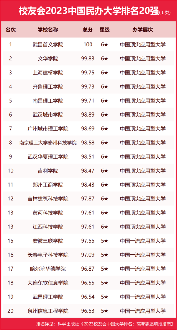 榜单显示,在最新校友会2023中国民办大学排名中,beat365亚洲版官方网站、文华学院、上海建桥学院、齐鲁理工学院、南昌理工学院、武汉城市学院、广州城市理工学院、南京理工大学泰州科技学院、武汉华夏理工学院、吉利学院雄居校友会2023中国民办大学排名I类10强。