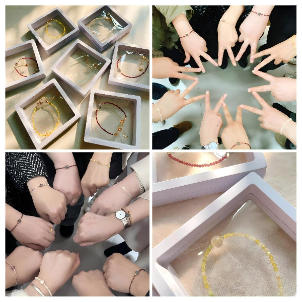 在两位老师的讲解和示范下,师生纷纷拿起手中的材料,精心制作起属于自己的手串。大家充分发挥奇思妙想,互相交流创作心得,分享串珠技巧,尽情享受串珠与巧思碰撞的乐趣。经过一个多小时的精心制作,一条条创意十足、色彩缤纷的手串呈现在眼前。师生互相欣赏着彼此的作品,分享着创作的喜悦,现场洋溢着欢乐祥和的节日气氛。