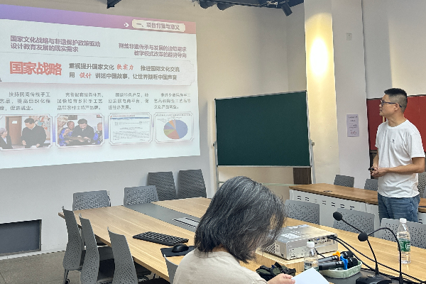 张钰老师通过分析学生学情,提出了“导-讲-练-展-评”的教学策略,以三师协同、数智承遗、科研反哺、双创育才为路径闭环非遗楚艺术设计传承培养模式。专家组肯定其文本撰写逻辑思路清晰,孙明海教授建议提炼概括创新点,提供更多前期论证。